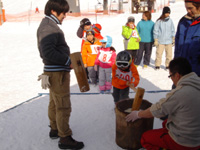 最近ではあまり見かけなくなった臼で餅をつき、お汁粉をふるまいました。